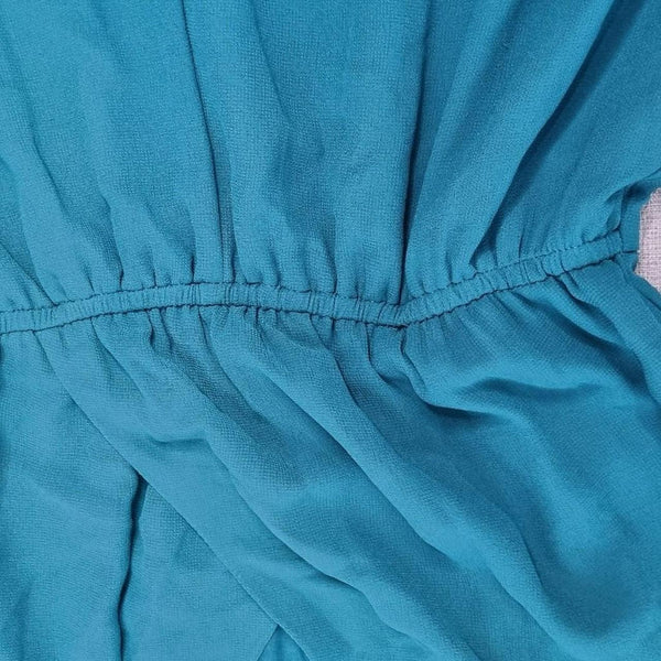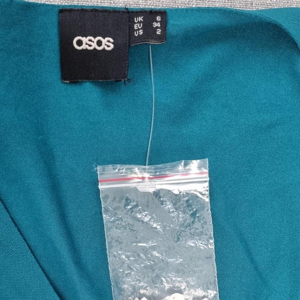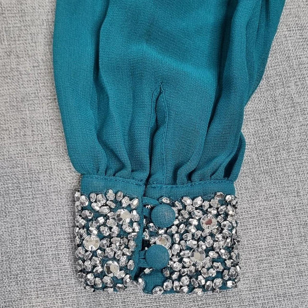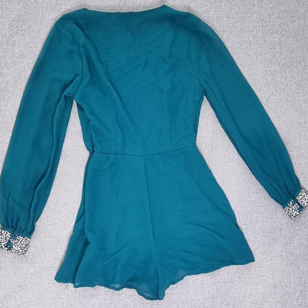 Teal romper playsuit with sparkling sequin jewel detailing on sleeves, featuring a V-neck and long sleeves. Fully lined body. Zipper side and stretch waist. ASOS. New without tags. Size 6.