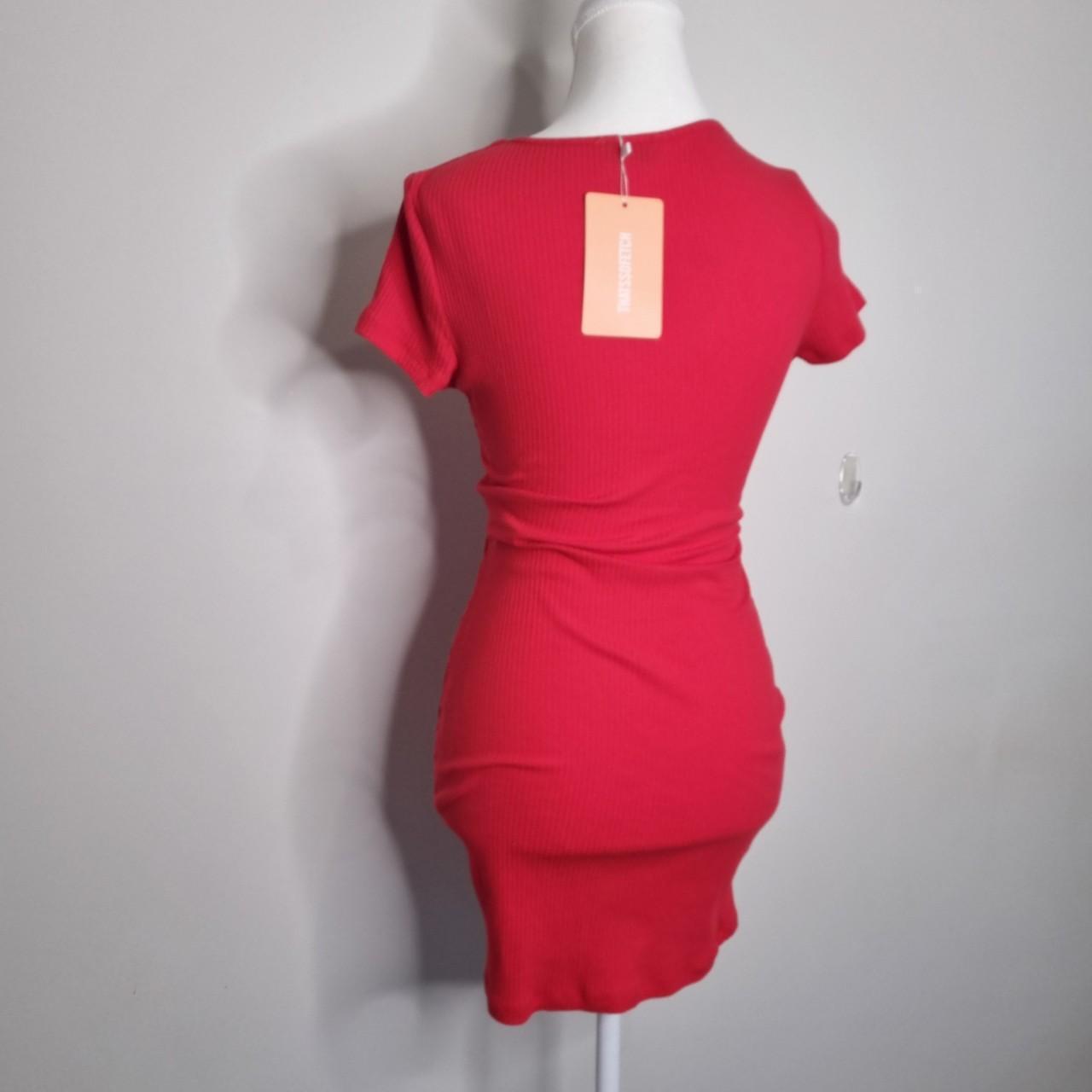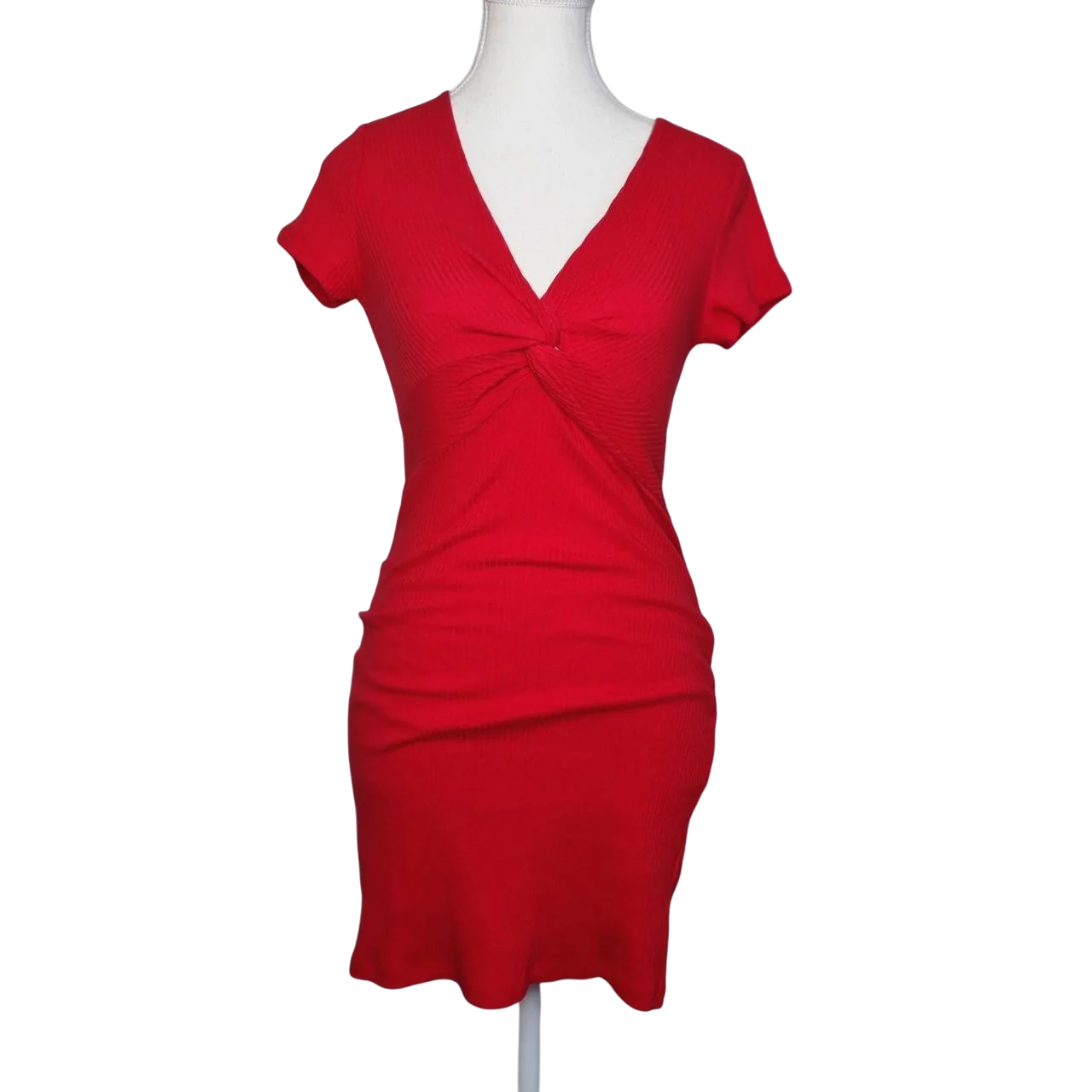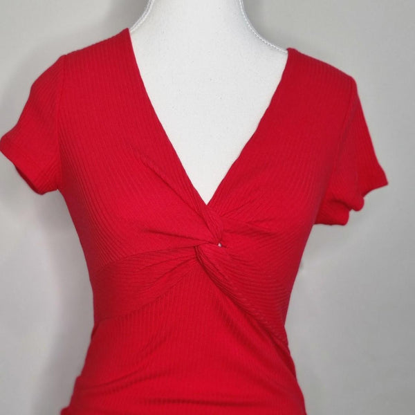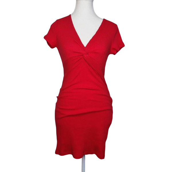 That's So Fetch Red ribbed mini dress with twist front. Stretch fabric.