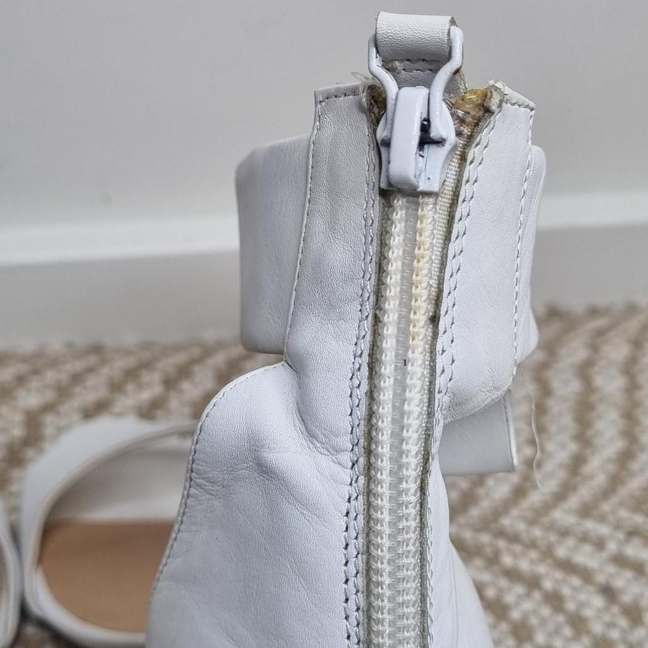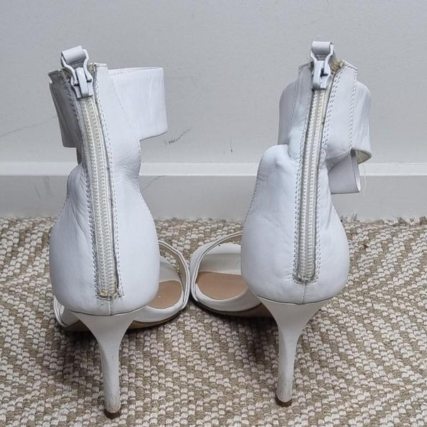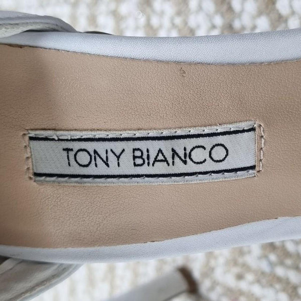 Tony Bianco White Leather Heels Size 7 Chic and timeless, these genuine leather Tony Bianco heels feature an open toe, slim stiletto heel, and statement ankle strap with back zip. Perfect for weddings, events, or a night out. - Brand: Tony Bianco - Size: AU 7 (EU 37.5 / US 7.5 approx.) - Colour: White - Material: Leather upper & lining, synthetic sole Condition: Pre-loved signs of wear on soles and light yellowing at zipper area. Some light scuff marks..