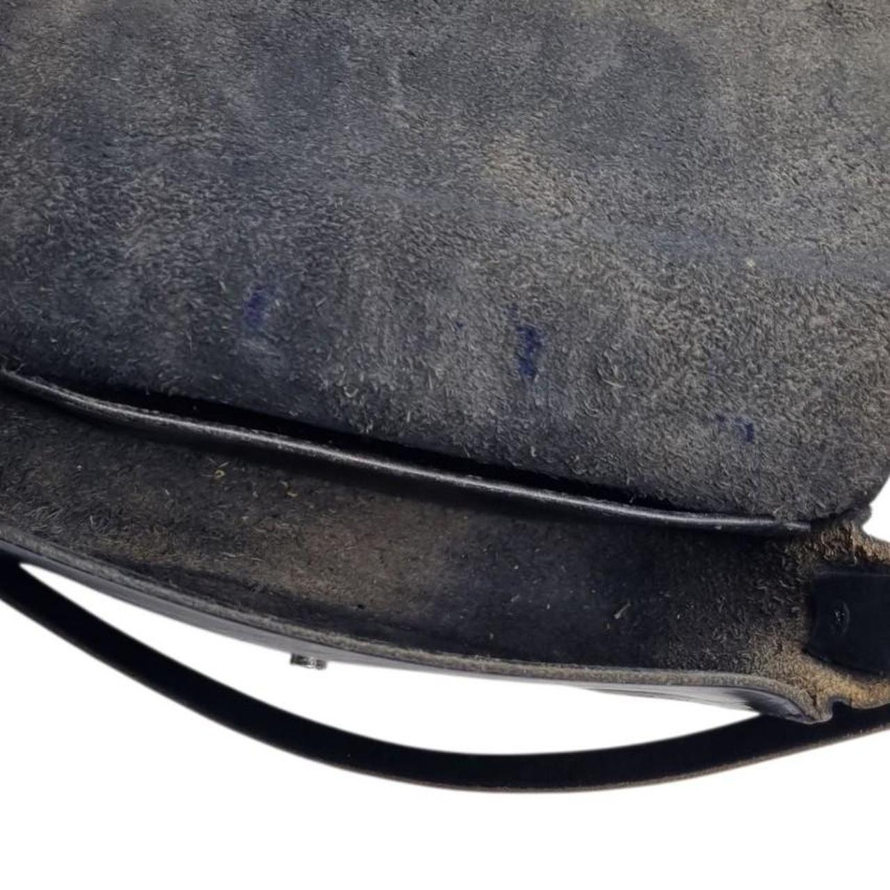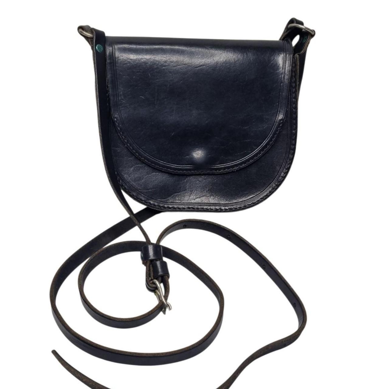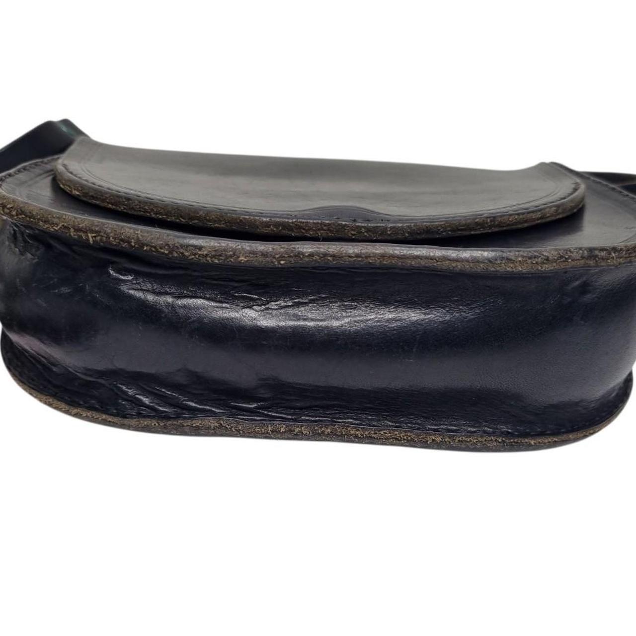 - Condition: Good vintage condition overall. Some natural creasing and light edge wear consistent with age. Small surface scuff/scratch on the back of the bag (see photos). Light pen marks under the flap and slight green tarnish/oxidation around some metal rivets inside (common in vintage leather bags). Interior shows normal wear and intact.