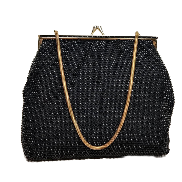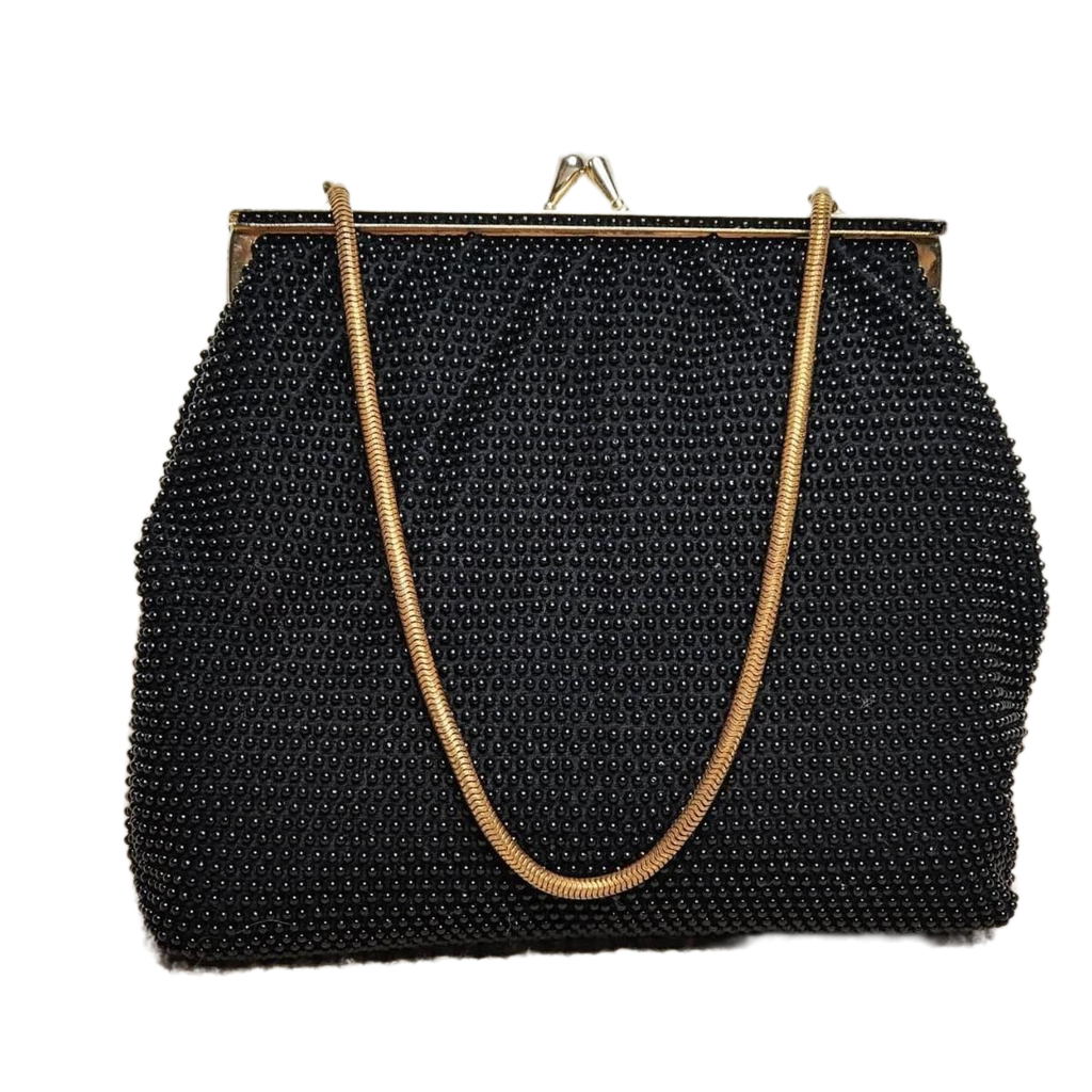 Vintage E. Munro ORNUM Clipper Evening Bag – Black Mesh, Gold Frame, Australian Made