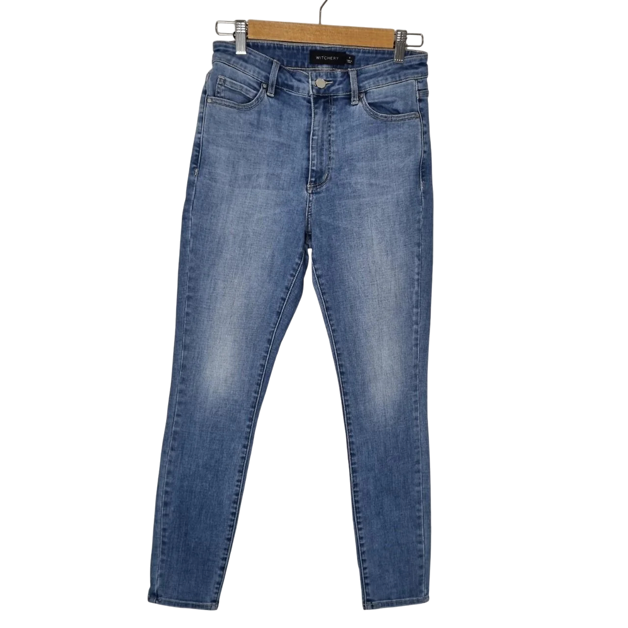 Classic mid-blue skinny jeans from Witchery. Designed with a flattering mid-to-high rise fit and a slim leg that works perfectly with boots, sneakers, or heels. Subtle faded wash detailing adds a stylish, lived-in look. A versatile wardrobe essential that can be dressed up or down year-round.